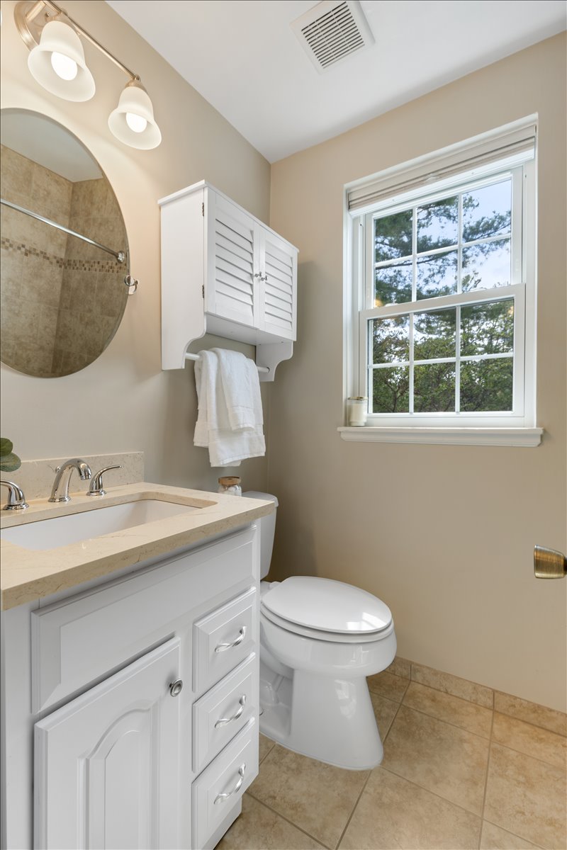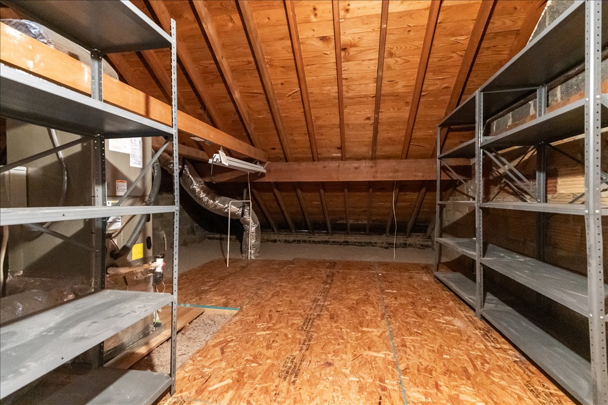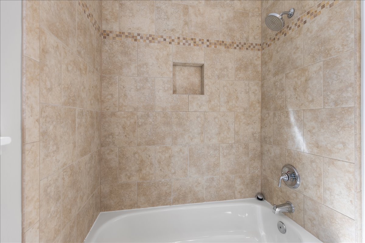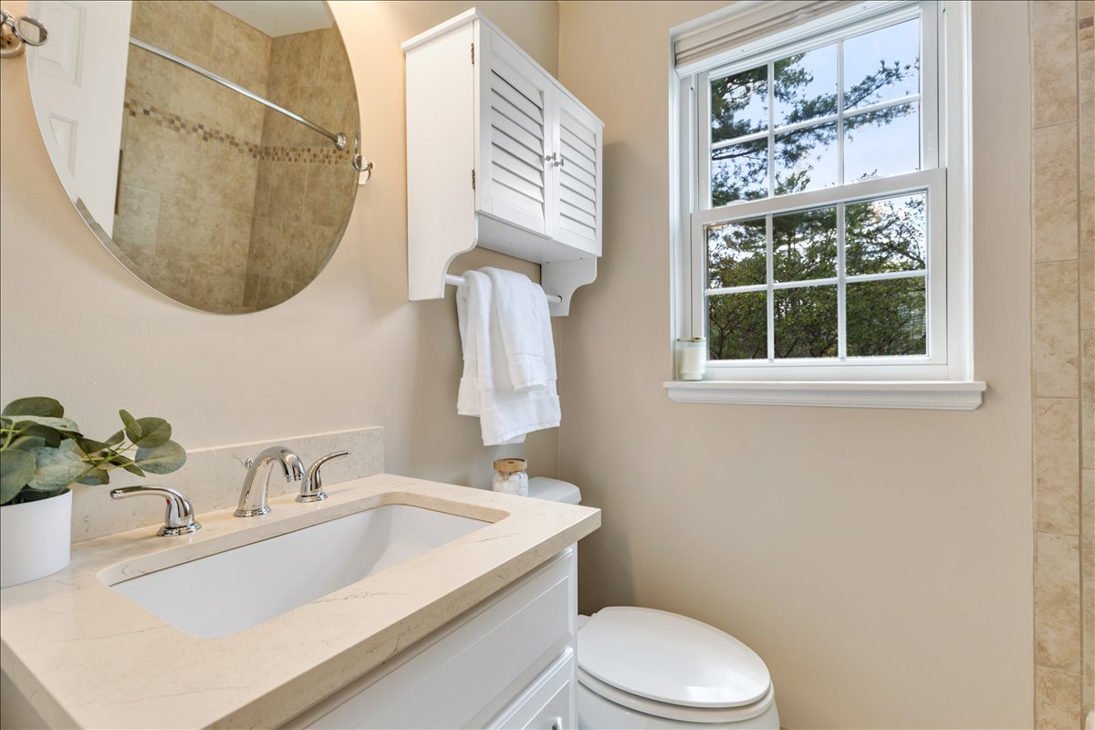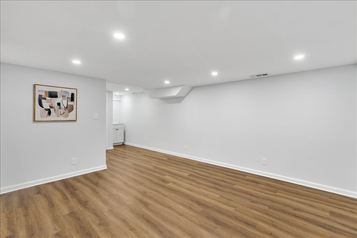Upstairs, the hallway includes a linen closet for added storage. The updated bathroom features a stone-topped vanity, medicine cabinet mirror, over-toilet storage, & an updated tiled shower with niche shelving. The spacious primary bedroom offers a ceiling fan with overhead lighting & a walk-in closet, while the 2nd bedroom includes a generously sized closet with shelving. The lower level expands your living options with updated LVP flooring & recessed lighting throughout the oversized recreation room. You’ll also find an under-stair storage/utility closet, an additional nook with a storage cabinet, & a convenient laundry closet with a newer full-sized washer and dryer (2024) + overhead shelving. The fully renovated lower-level bathroom is beautifully finished with patterned tile flooring, a stone-topped vanity, & a large white tiled shower with sliding glass doors, a corner bench, & niche shelving.