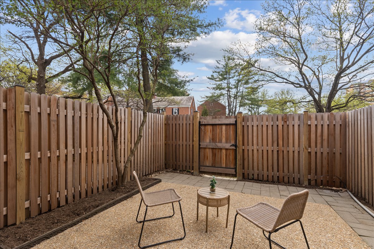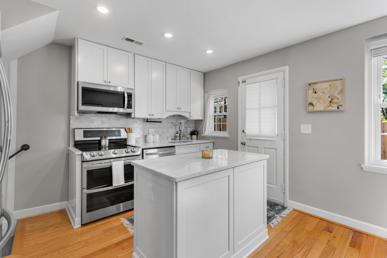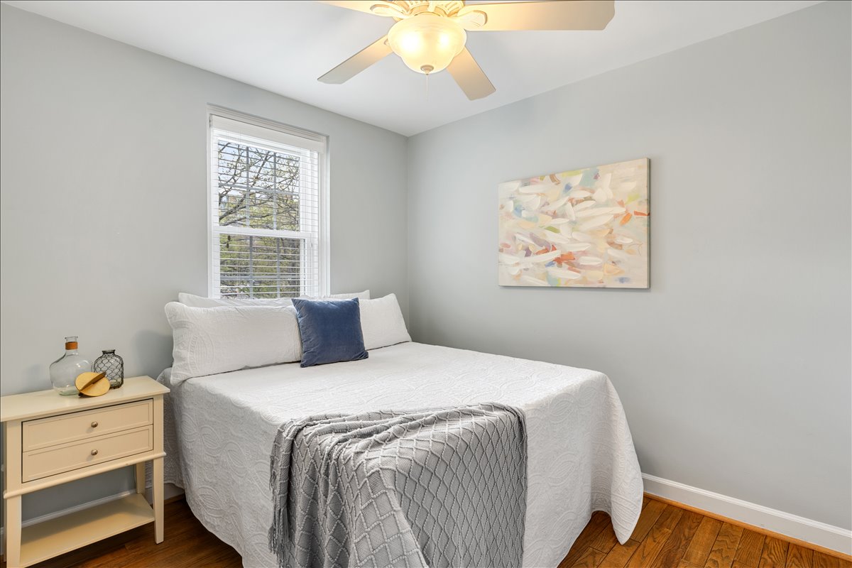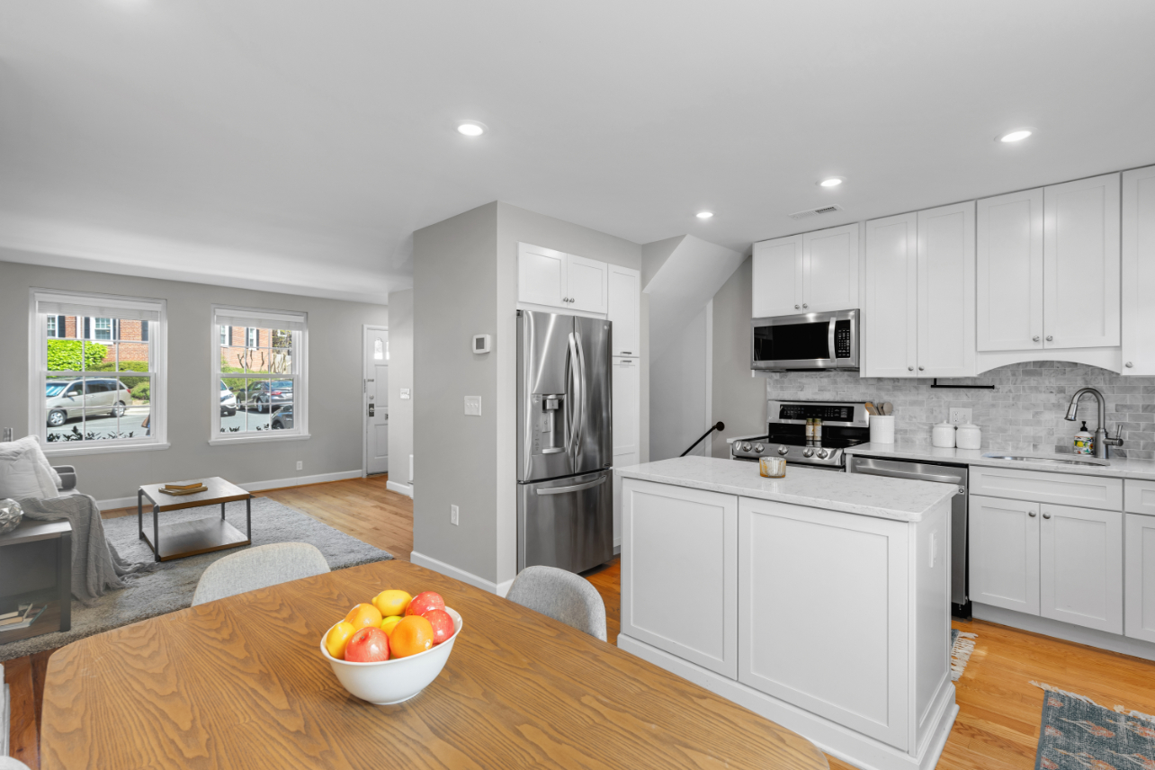 Gorgeous 2-bedroom, 2-bathroom Clarendon II townhome nestled in sought-after Fairlington Villages! A welcoming entry with a convenient coat closet opens into the spacious living room, featuring gleaming hardwood floors & neutral paint throughout the main level. The renovated open kitchen is a true highlight, showcasing soft-close white cabinetry with under-cabinet lighting, stainless steel appliances, quartz countertops, & a stunning tile backsplash. A separate dining area with recessed lighting overlooks the private back patio – perfect for everyday living & entertaining.