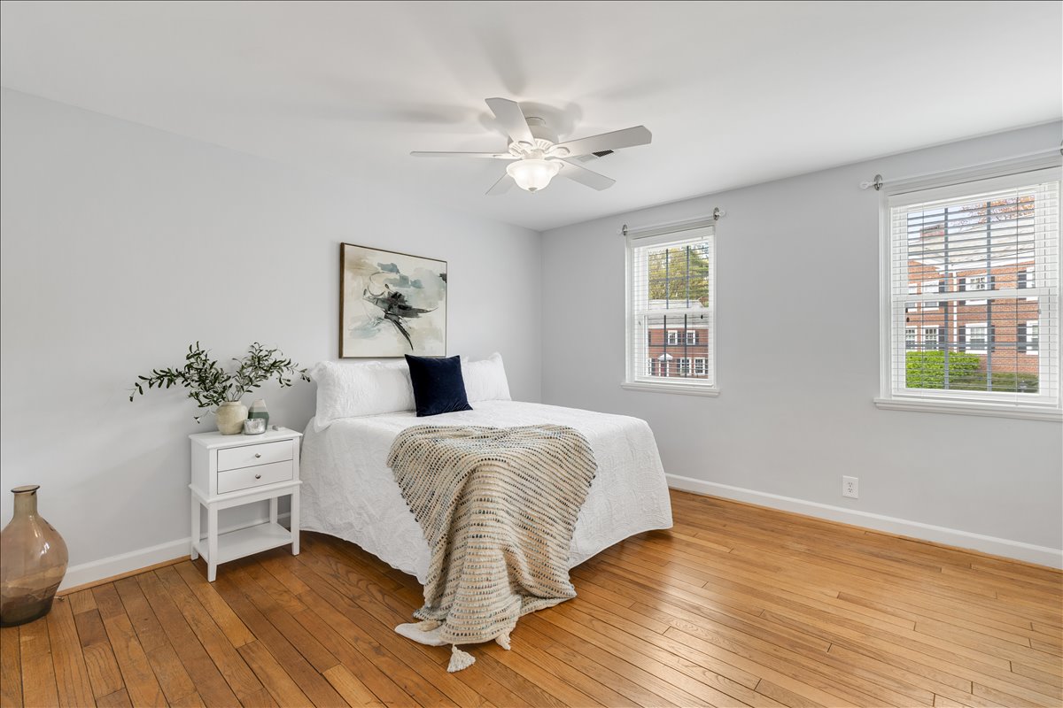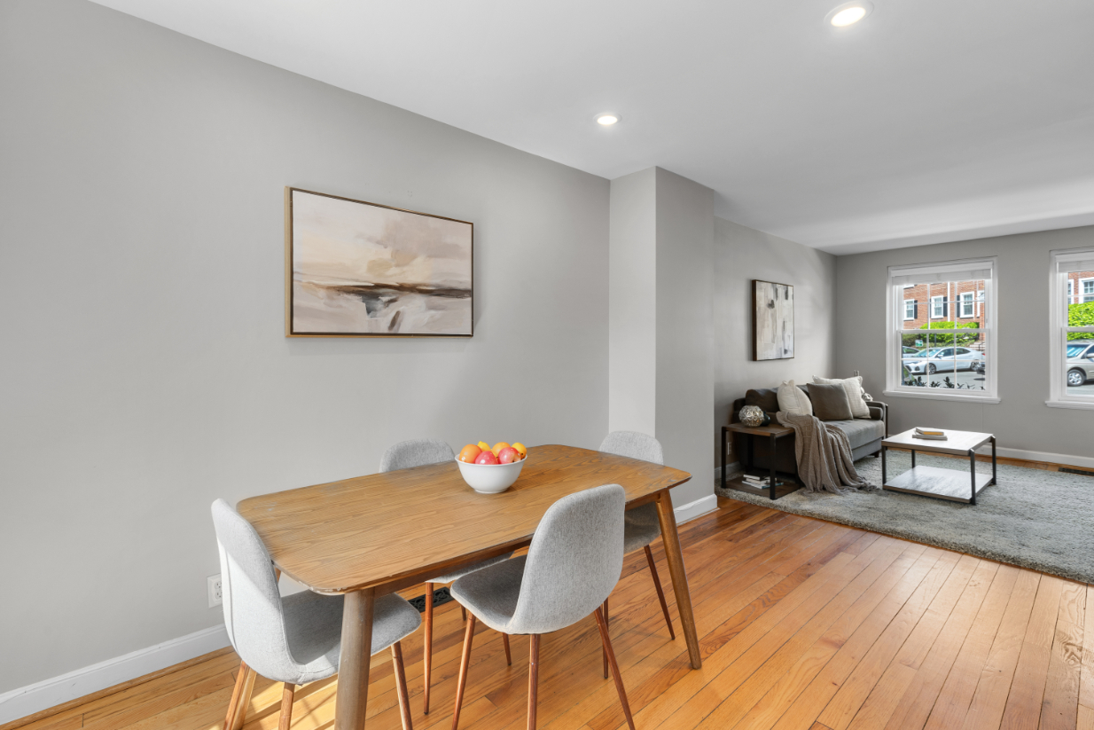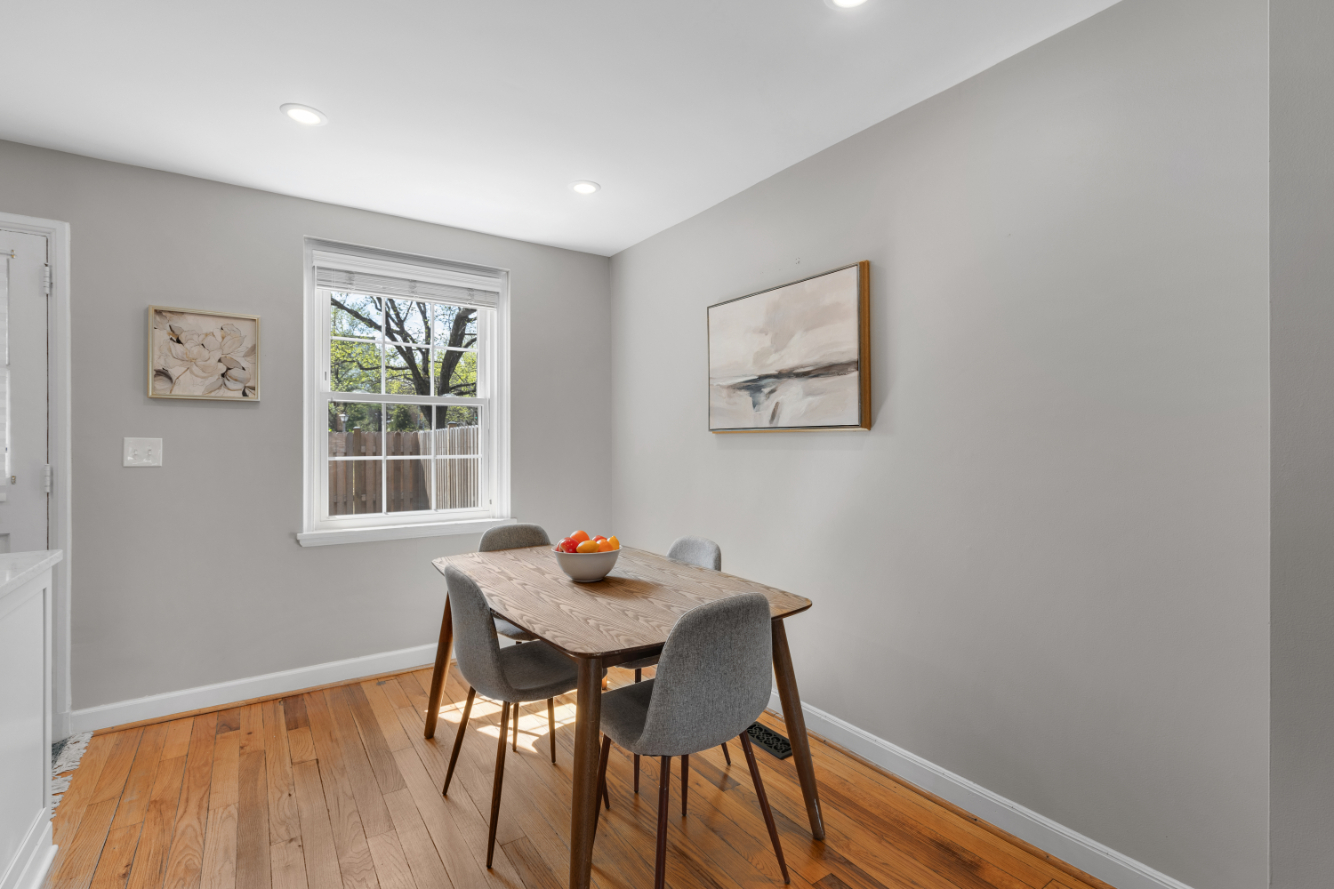 Gorgeous 2-bedroom, 2-bathroom Clarendon II townhome nestled in sought-after Fairlington Villages! A welcoming entry with a convenient coat closet opens into the spacious living room, featuring gleaming hardwood floors & neutral paint throughout the main level. The renovated open kitchen is a true highlight, showcasing soft-close white cabinetry with under-cabinet lighting, stainless steel appliances, quartz countertops, & a stunning tile backsplash. A separate dining area with recessed lighting overlooks the private back patio – perfect for everyday living & entertaining.