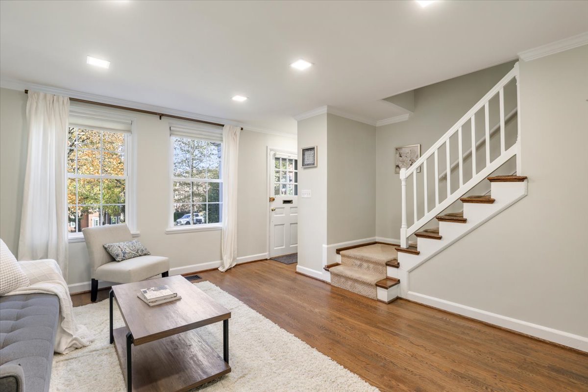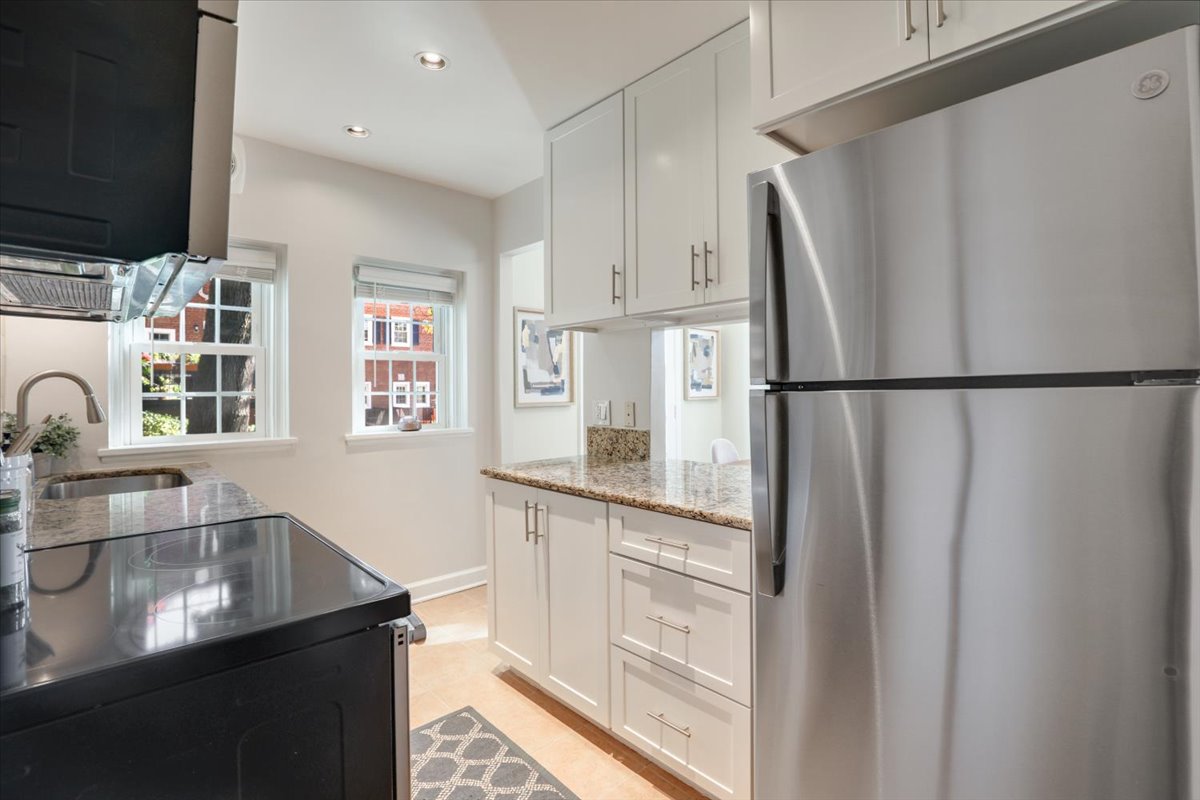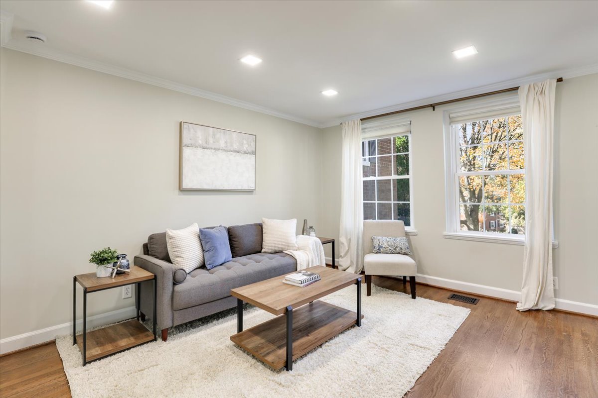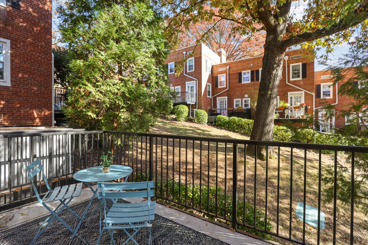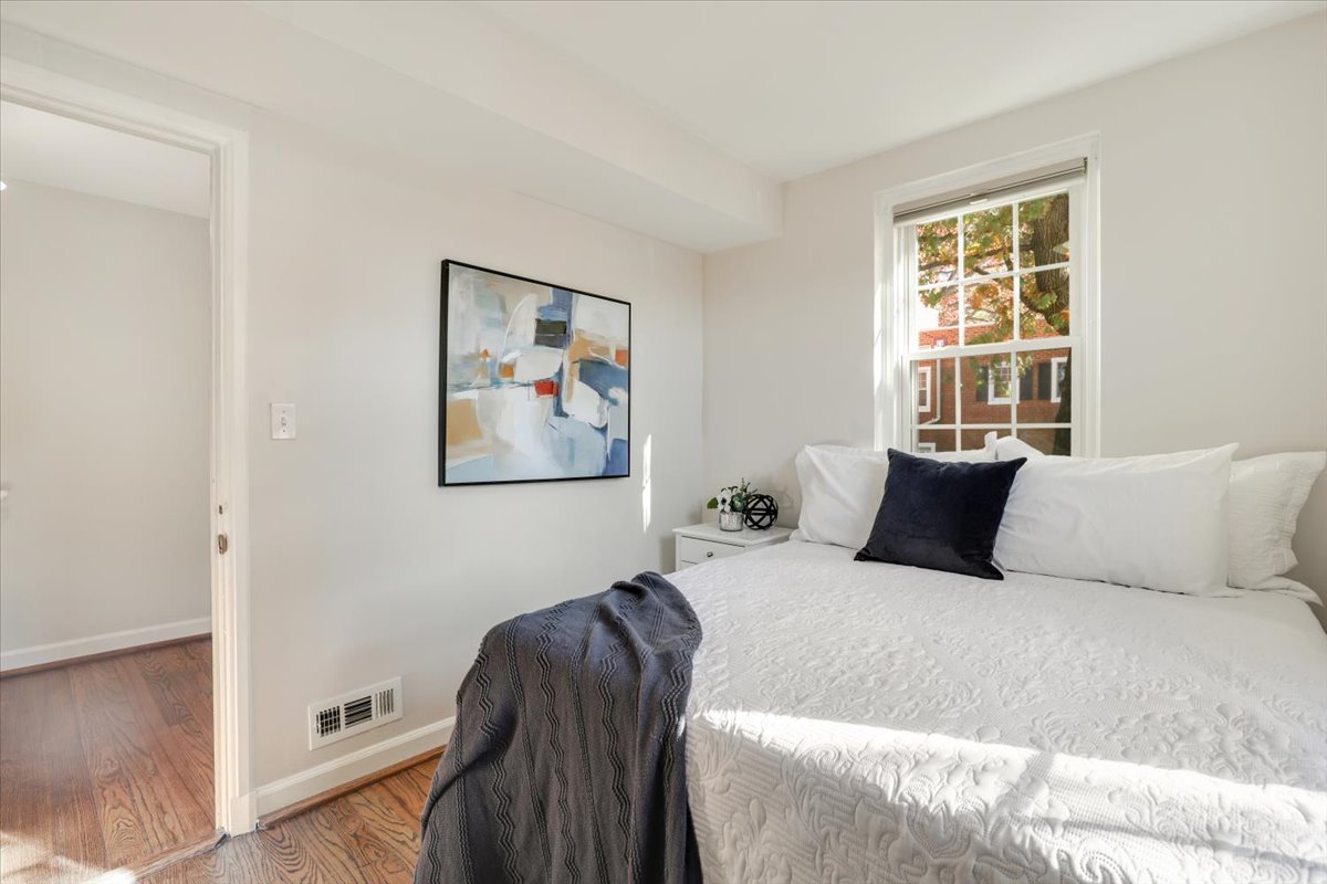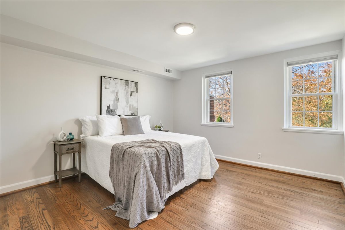 Beautiful 2-bedroom, 2-bathroom Clarendon II model townhome nestled in Fairlington Villages! Step inside to a welcoming coat closet entry that opens to a bright and inviting main level featuring gleaming hardwood floors, recessed lighting, crown molding, and updated vinyl windows throughout. The dining area offers an overhead light fixture and access to a private balcony, perfect for morning coffee or evening relaxation. The kitchen is accented with updated white cabinetry, granite countertops, a tile backsplash, tile flooring, & stainless steel appliances including a newer refrigerator (2021). Upstairs, you’ll find a spacious primary bedroom with overhead lighting and a walk-in closet with custom shelving. A 2nd bedroom with overhead lighting, a closet, & windows on two sides for wonderful natural light and an updated bathroom with a vanity and tiled shower with corner shelving complete this level.