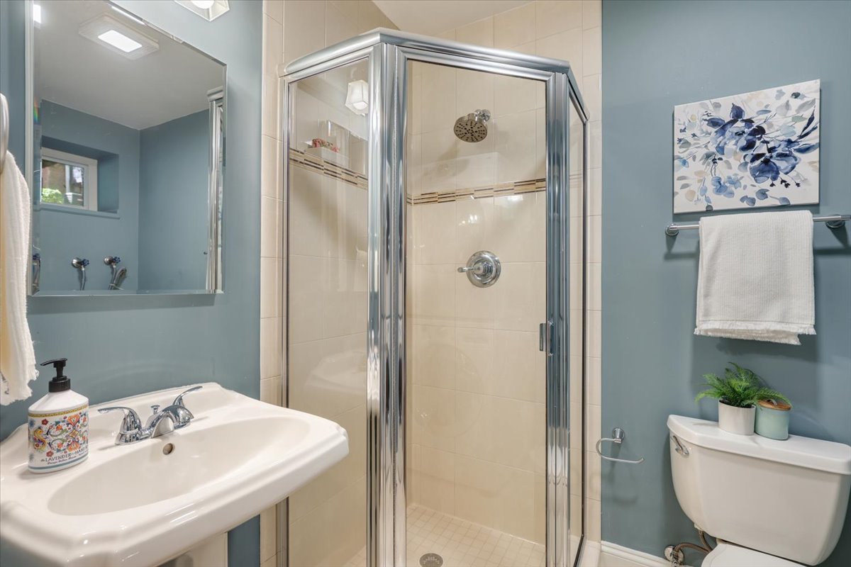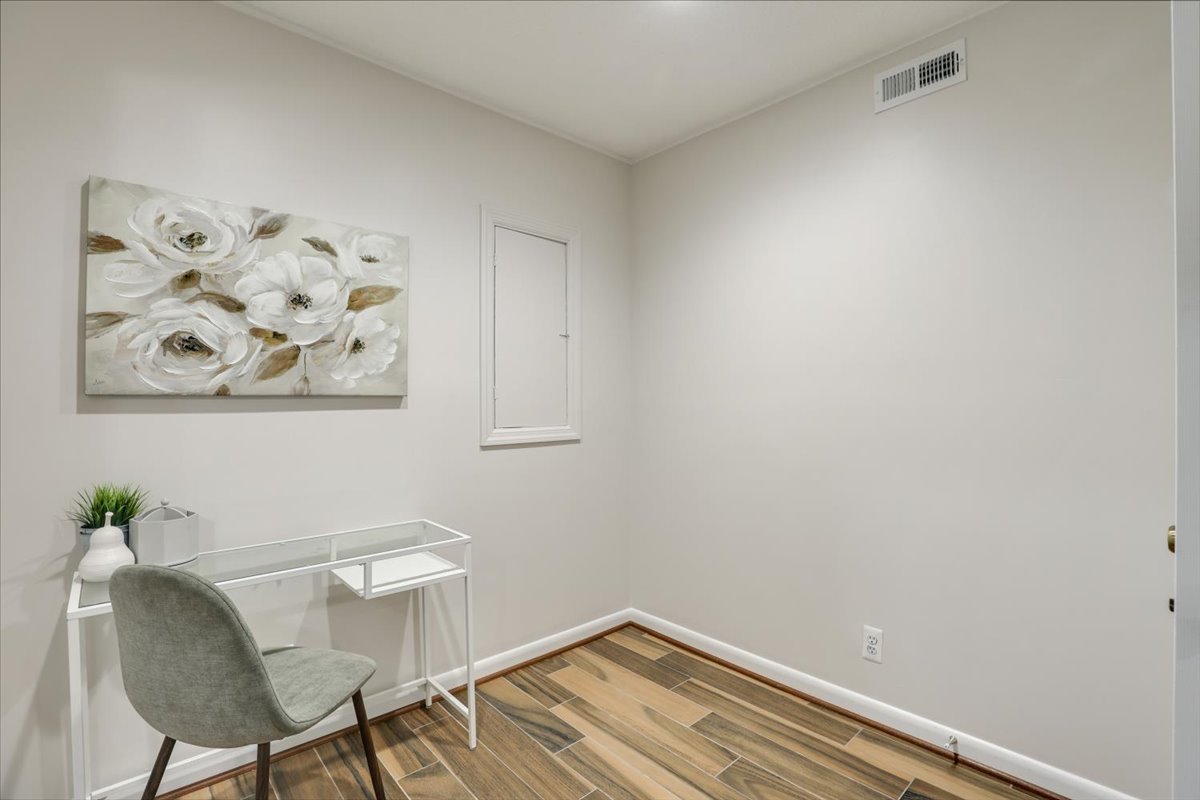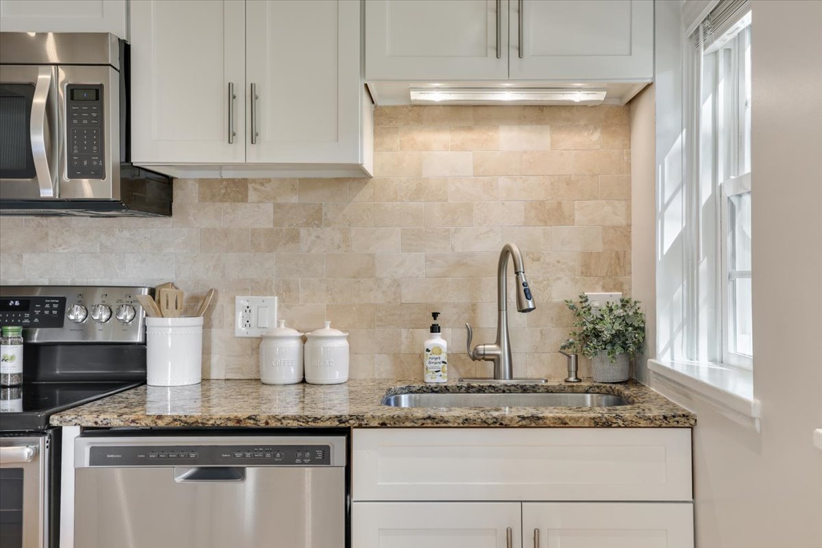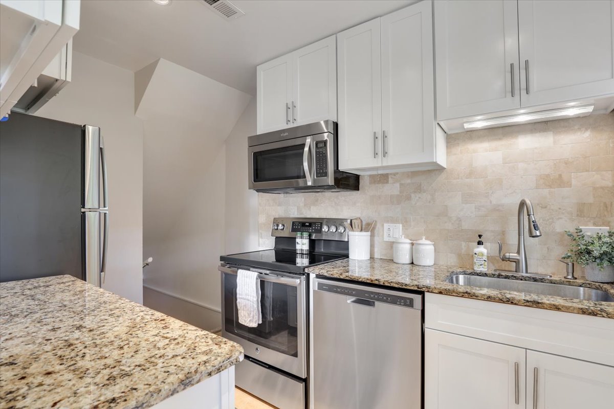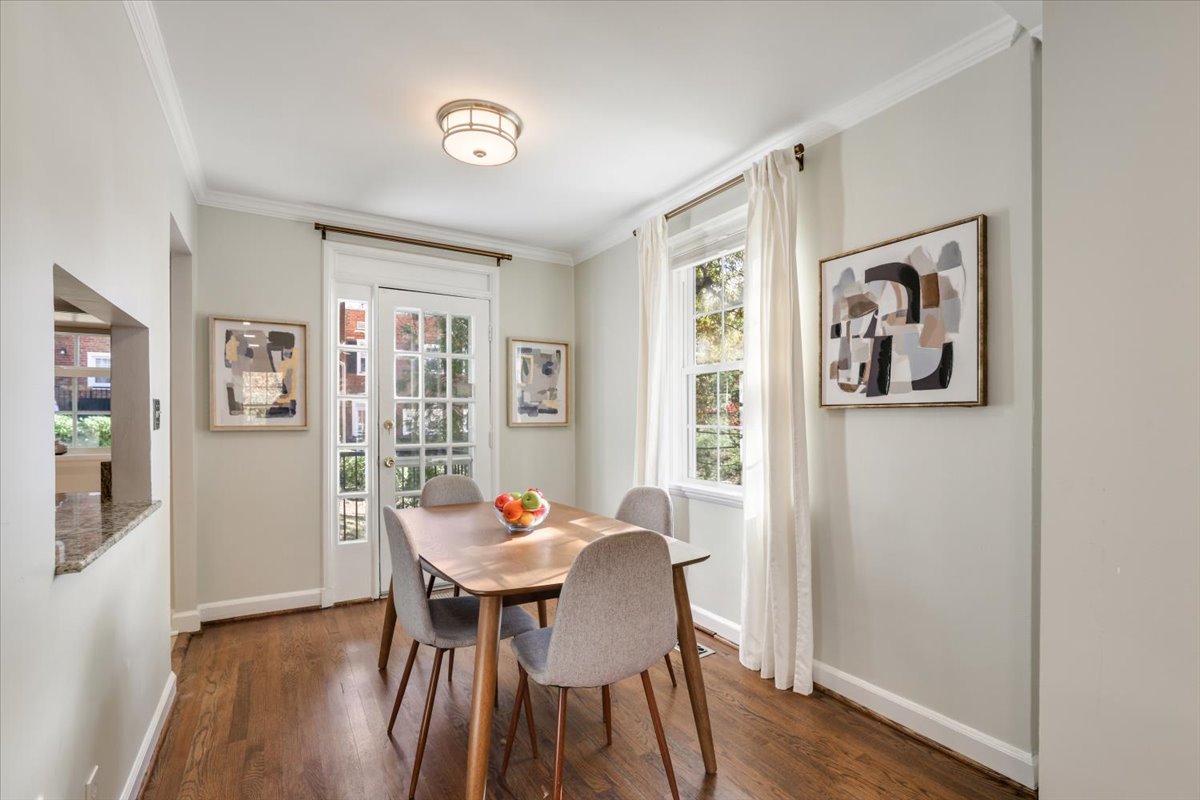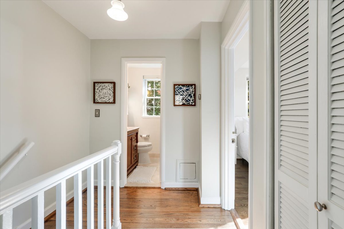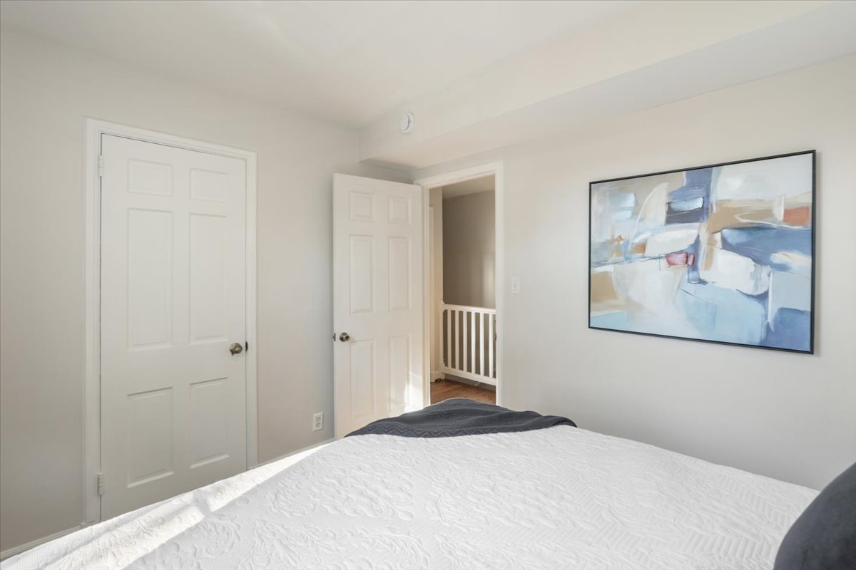 Beautiful 2-bedroom, 2-bathroom Clarendon II model townhome nestled in Fairlington Villages! Step inside to a welcoming coat closet entry that opens to a bright and inviting main level featuring gleaming hardwood floors, recessed lighting, crown molding, and updated vinyl windows throughout. The dining area offers an overhead light fixture and access to a private balcony, perfect for morning coffee or evening relaxation. The kitchen is accented with updated white cabinetry, granite countertops, a tile backsplash, tile flooring, & stainless steel appliances including a newer refrigerator (2021). Upstairs, you’ll find a spacious primary bedroom with overhead lighting and a walk-in closet with custom shelving. A 2nd bedroom with overhead lighting, a closet, & windows on two sides for wonderful natural light and an updated bathroom with a vanity and tiled shower with corner shelving complete this level.