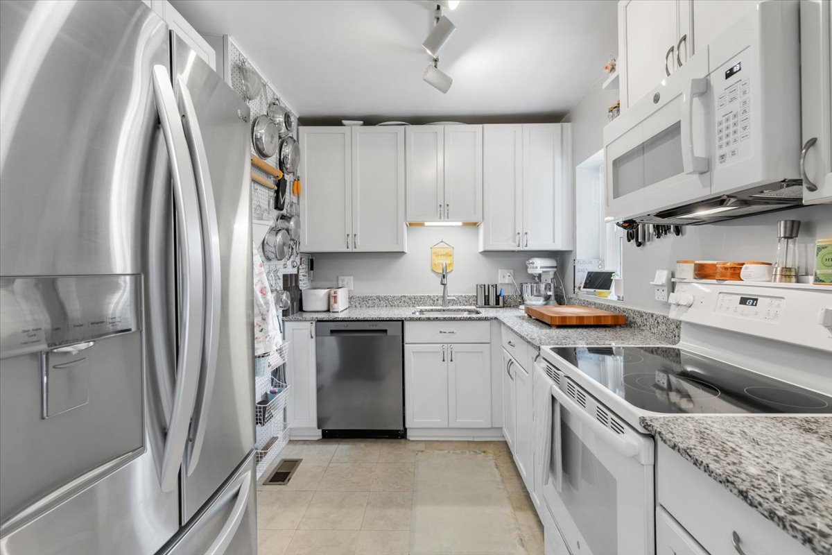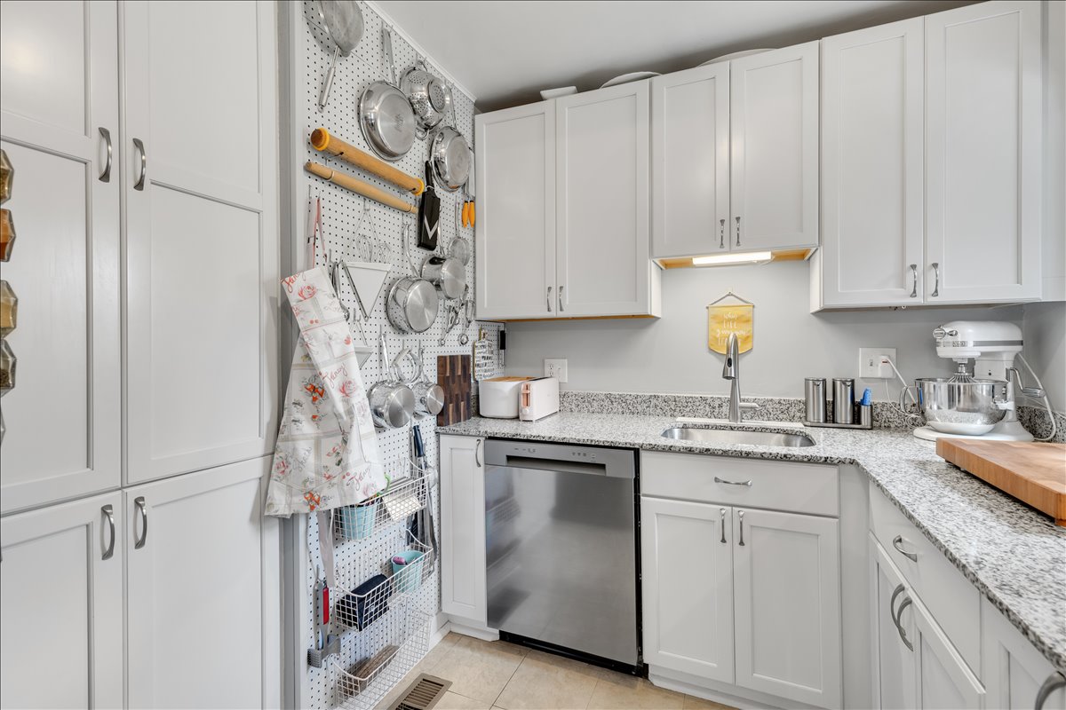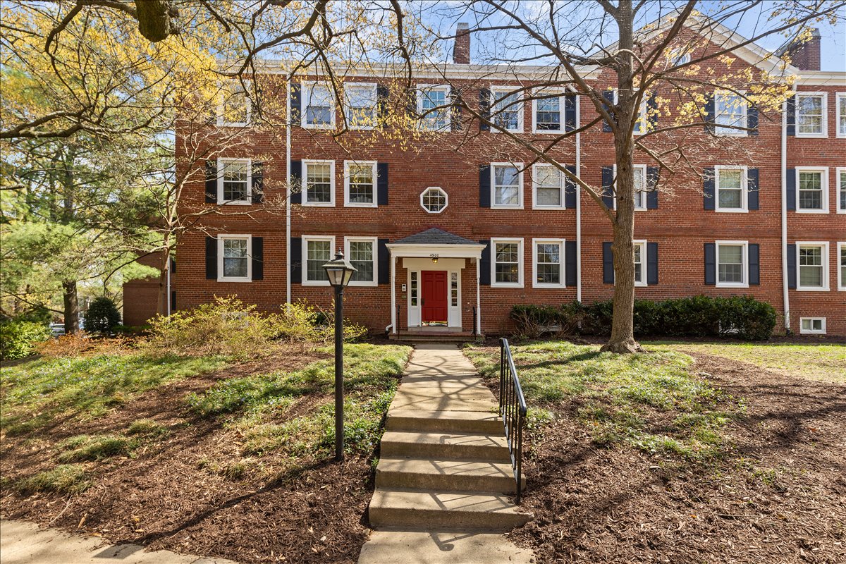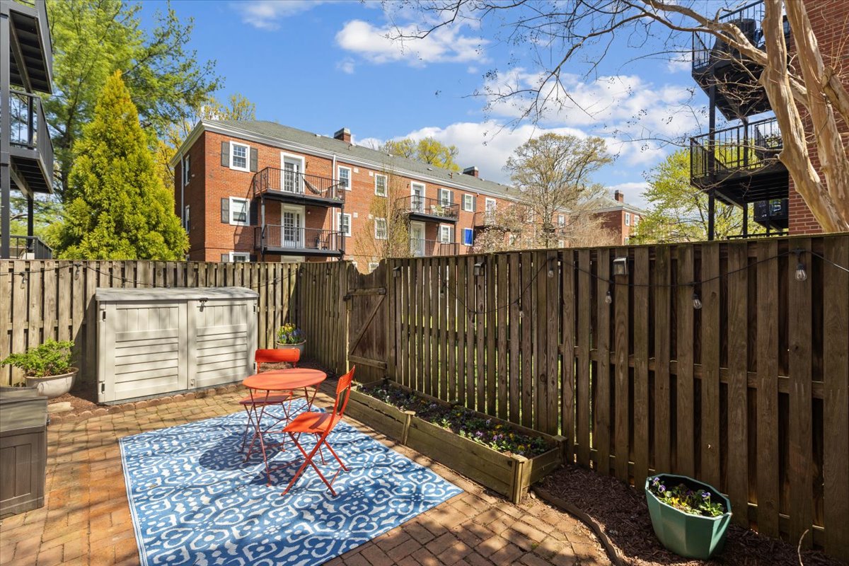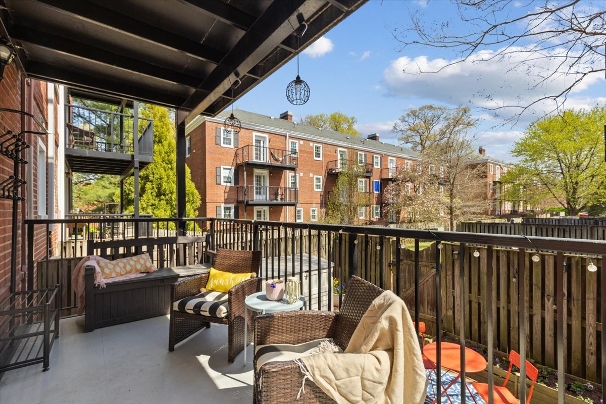 Gorgeous 1-bedroom, 2-bathroom Barcroft model home nestled in sought-after Fairlington Villages! A welcoming front entry with a convenient coat closet opens into the spacious main living area, featuring hardwood flooring & neutral paint throughout. The dining area is accented with a modern chandelier & offers direct access through a French door to the back balcony and private fenced-in brick patio – a fantastic space for relaxing or entertaining. The kitchen showcases tile flooring, updated soft-close white cabinetry, granite countertops, over-sink lighting, & new stainless steel refrigerator (2025), stainless steel dishwasher (2026), & microwave (2026). The main-level bathroom features tile flooring, a stone-topped vanity, a medicine cabinet mirror, & a sparkling white tiled shower. The primary bedroom offers a comfortable & well-designed retreat with built-in nightstands & sconce lighting, a large armoire featuring recessed accent lighting & two closets including a walk-in with a dresser that conveys.