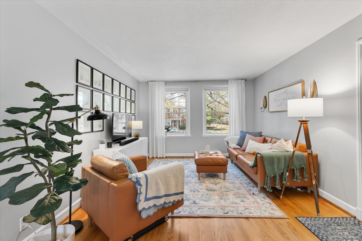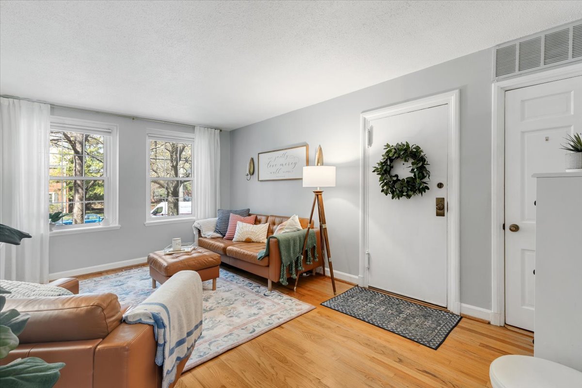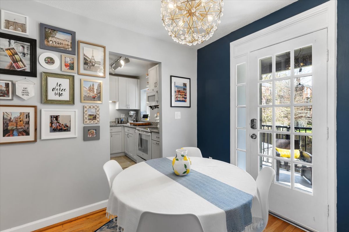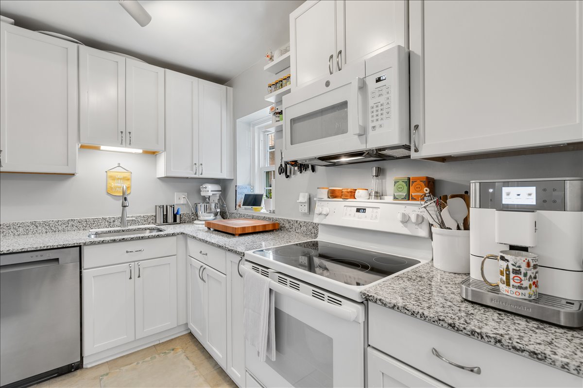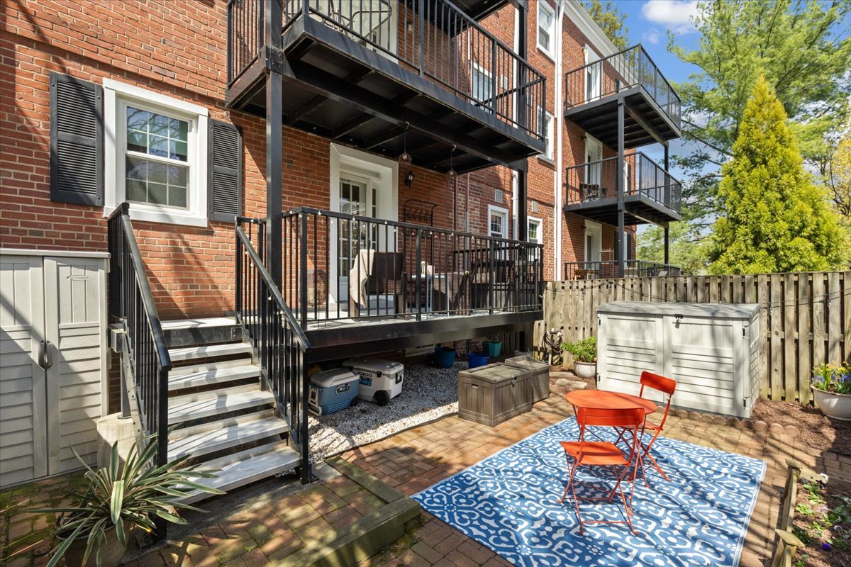 Gorgeous 1-bedroom, 2-bathroom Barcroft model home nestled in sought-after Fairlington Villages! A welcoming front entry with a convenient coat closet opens into the spacious main living area, featuring hardwood flooring & neutral paint throughout. The dining area is accented with a modern chandelier & offers direct access through a French door to the back balcony and private fenced-in brick patio – a fantastic space for relaxing or entertaining. The kitchen showcases tile flooring, updated soft-close white cabinetry, granite countertops, over-sink lighting, & new stainless steel refrigerator (2025), stainless steel dishwasher (2026), & microwave (2026). The main-level bathroom features tile flooring, a stone-topped vanity, a medicine cabinet mirror, & a sparkling white tiled shower. The primary bedroom offers a comfortable & well-designed retreat with built-in nightstands & sconce lighting, a large armoire featuring recessed accent lighting & two closets including a walk-in with a dresser that conveys.