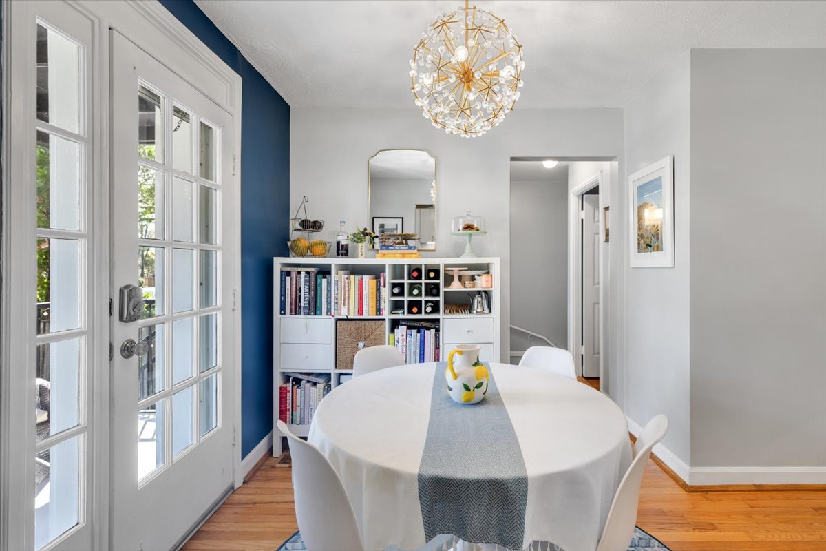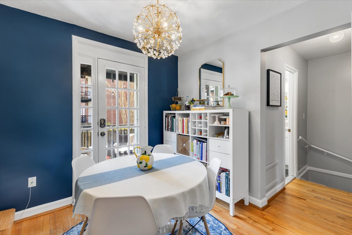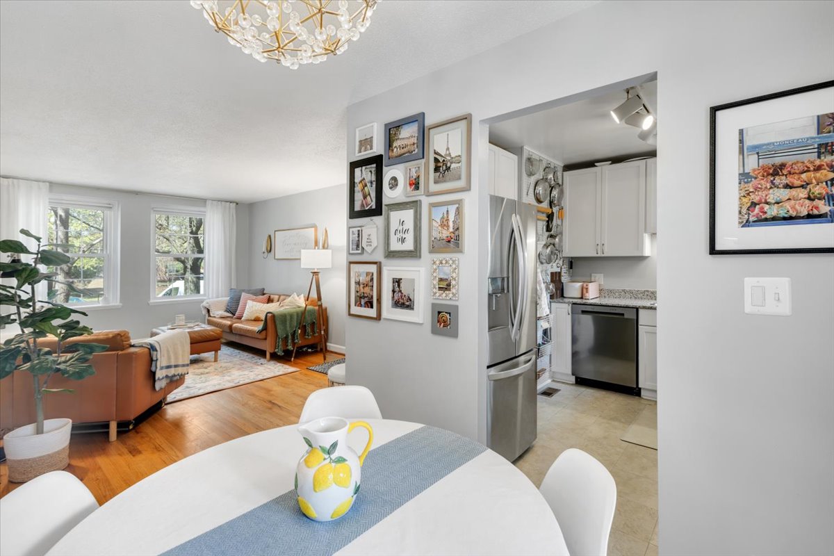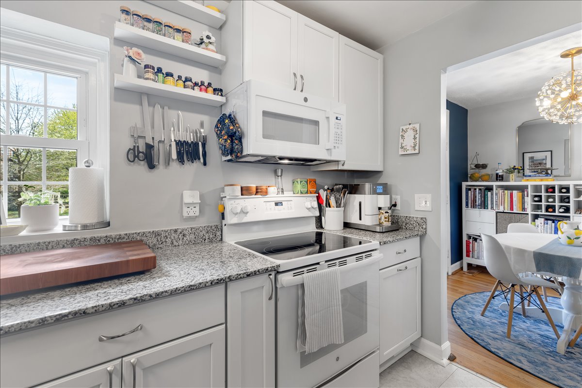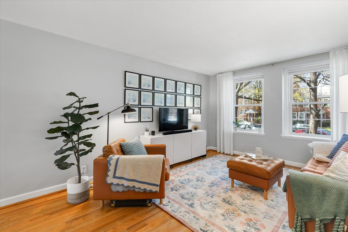 Gorgeous 1-bedroom, 2-bathroom Barcroft model home nestled in sought-after Fairlington Villages! A welcoming front entry with a convenient coat closet opens into the spacious main living area, featuring hardwood flooring & neutral paint throughout. The dining area is accented with a modern chandelier & offers direct access through a French door to the back balcony and private fenced-in brick patio – a fantastic space for relaxing or entertaining. The kitchen showcases tile flooring, updated soft-close white cabinetry, granite countertops, over-sink lighting, & new stainless steel refrigerator (2025), stainless steel dishwasher (2026), & microwave (2026). The main-level bathroom features tile flooring, a stone-topped vanity, a medicine cabinet mirror, & a sparkling white tiled shower. The primary bedroom offers a comfortable & well-designed retreat with built-in nightstands & sconce lighting, a large armoire featuring recessed accent lighting & two closets including a walk-in with a dresser that conveys.