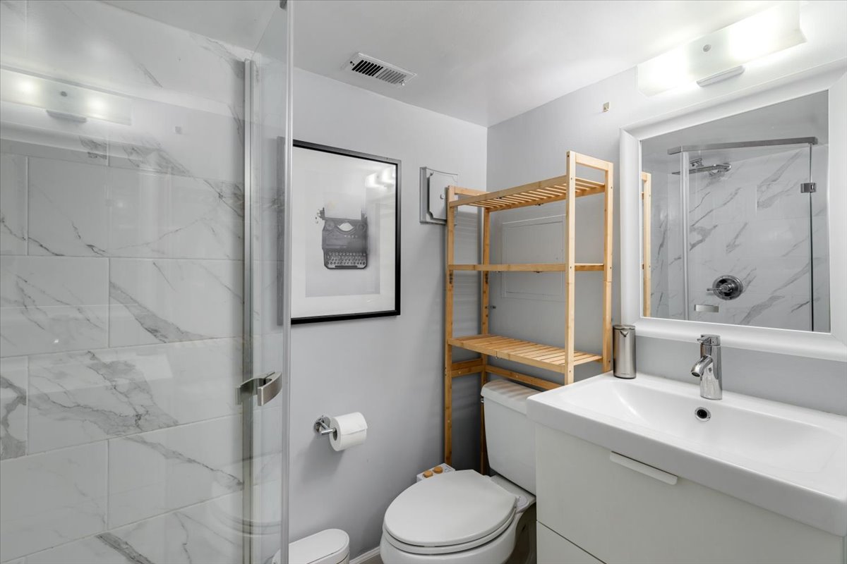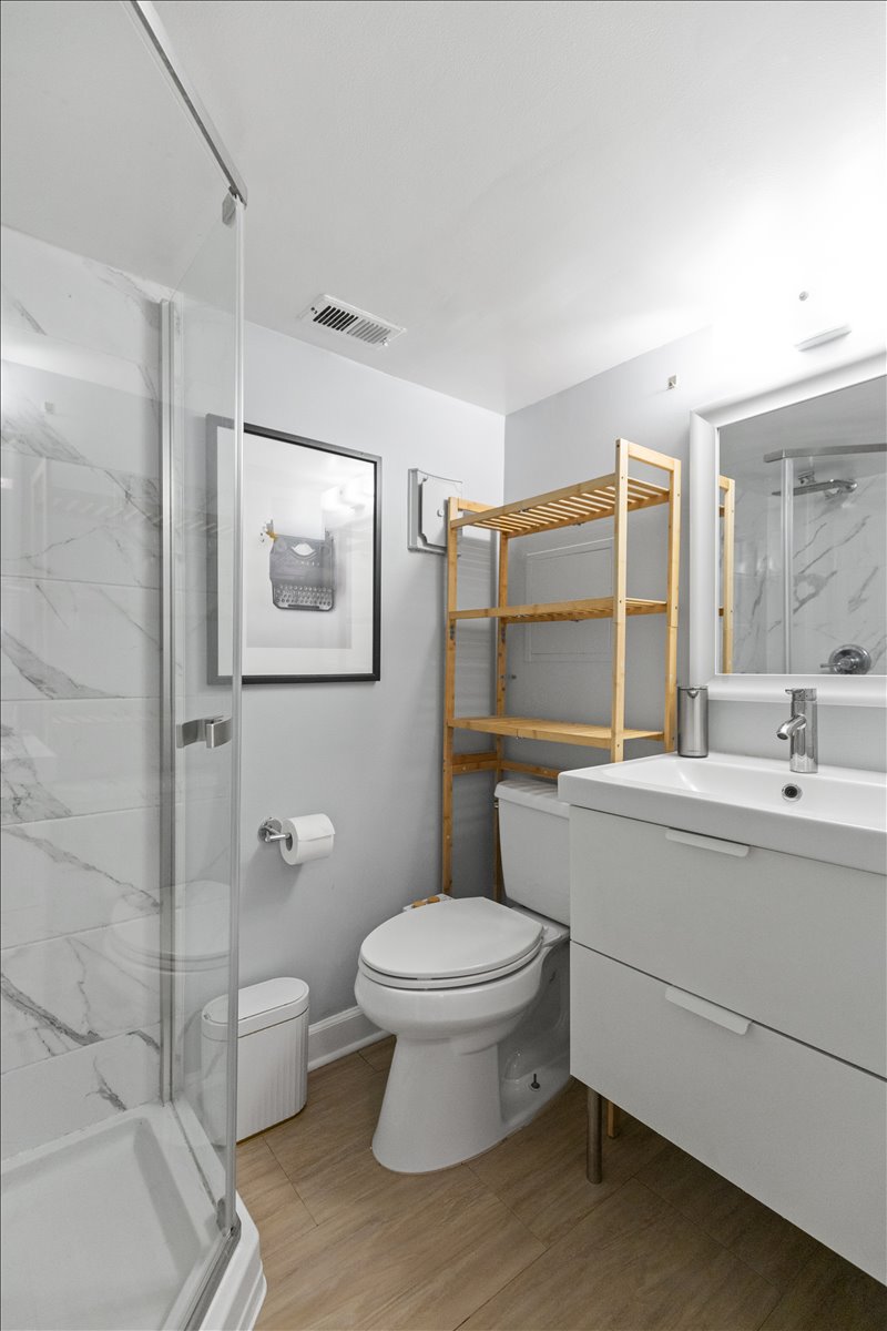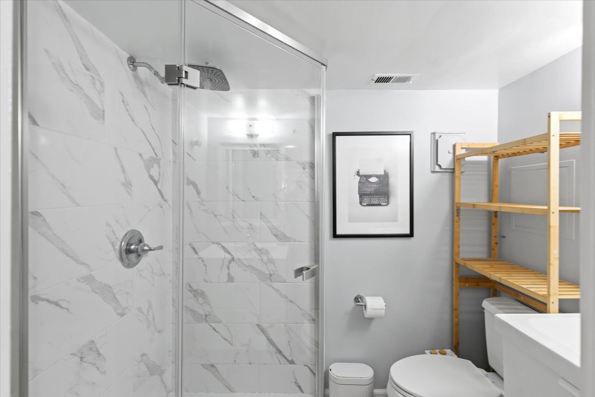 The carpeted lower level expands your living space with a versatile bonus room with pocket door at the bottom of the stairs – perfect for guests or a home office. The hallway includes two large armoires with recessed accent lighting, as well as a linen closet for added storage. The renovated lower-level bathroom (2024) features tile flooring, a glass-enclosed tiled shower with a rainfall showerhead, & a modern white vanity. The huge recreation room offers incredible flexibility as a second living area, media space, or workout room, & includes a separate entrance. A utility/storage/laundry room completes the home with a full-sized washer & dryer, a new water heater (2025), and a newer HVAC system (2022) with newly added EnviroAire Dual Lamp UV air purifying system (2025). This home includes two reserved/unassigned parking spaces. Fairlington Villages residents enjoy exceptional amenities including six pools, lighted tennis courts, tot lots/playgrounds, and walking paths. Ideally located near I-395 and just minutes to The Village at Shirlington, West Alex, Baileys Crossroads, Del Ray, and Old Town – offering unbeatable convenience to shopping, dining, and commuting options.