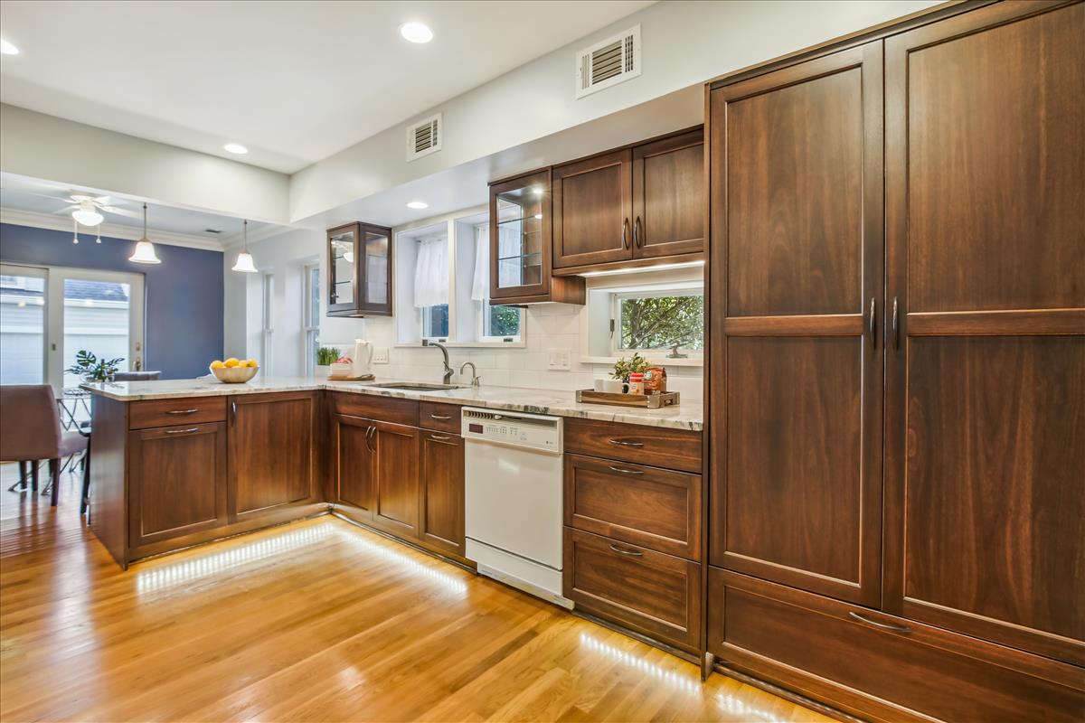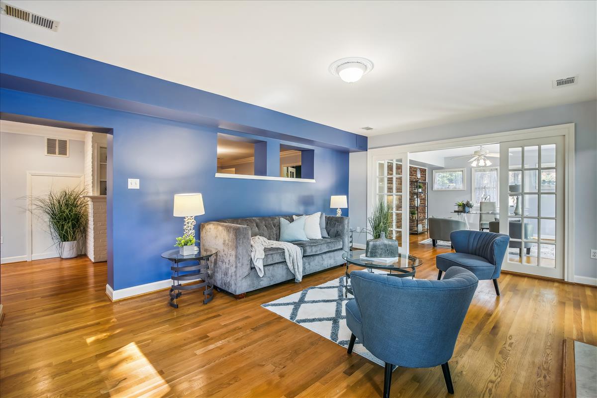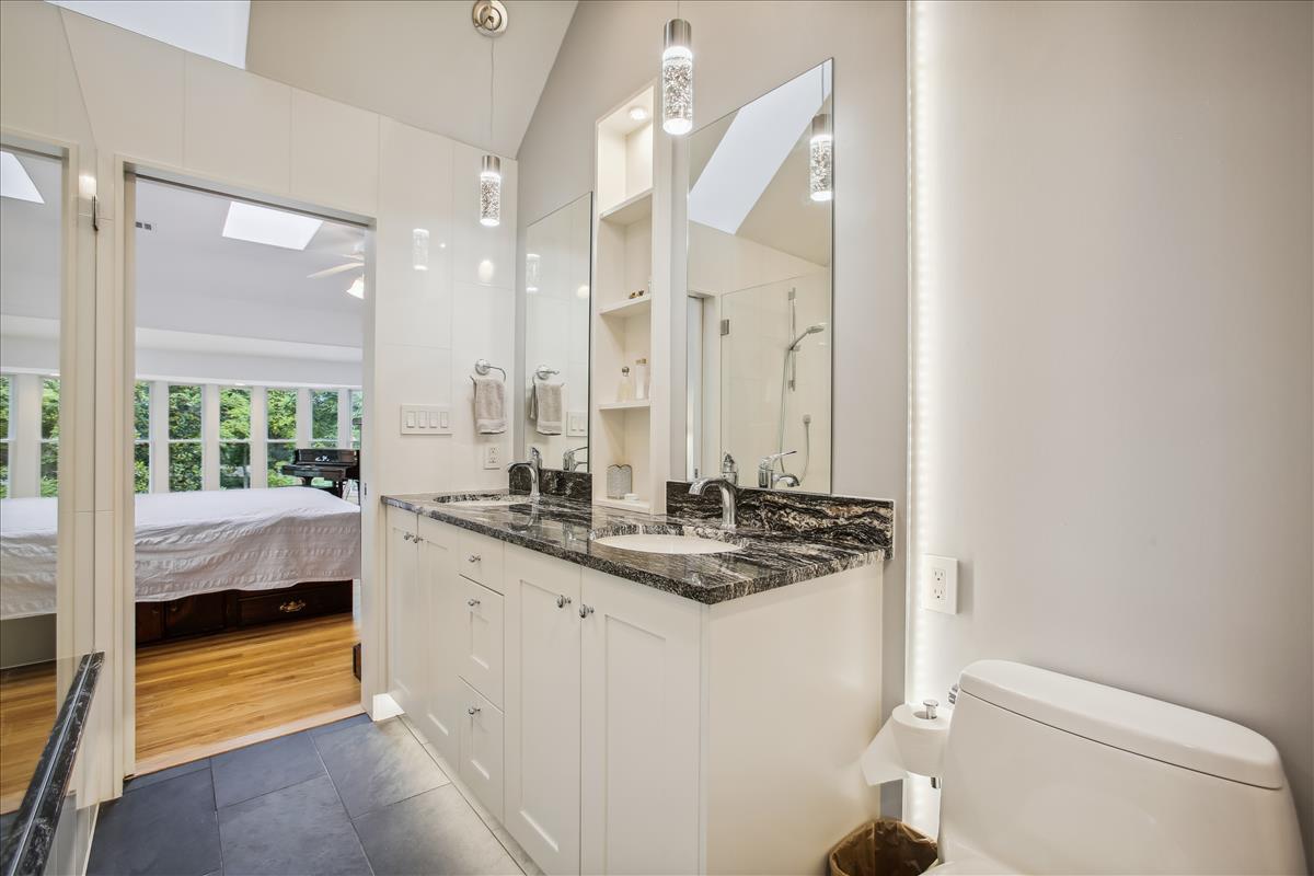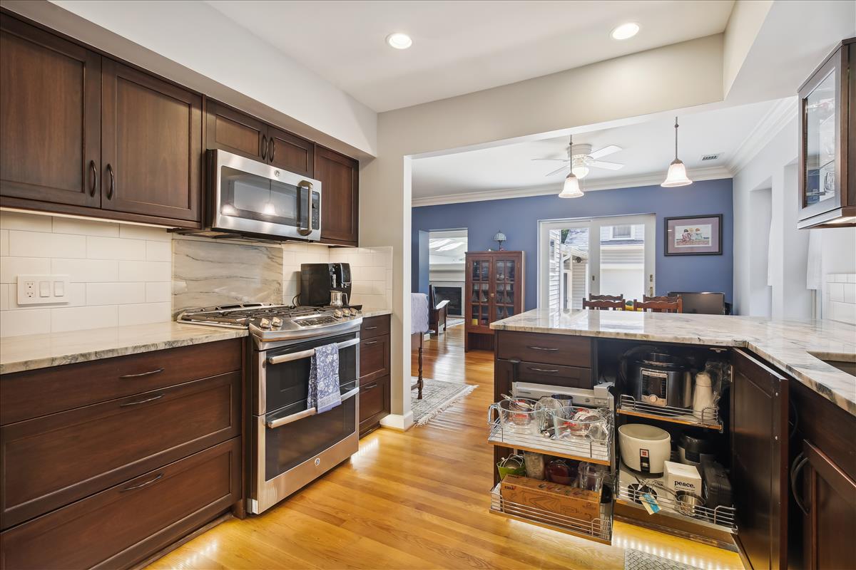 Gorgeous 5-bedroom, 3.5-bathroom single family home located in the heart of Falls Church City with a huge .3 acre lot! Home includes a recently updated kitchen (2018) with quartzite countertops and oversized peninsula, recessed lighting, soft close cabinetry, and new refrigerator (2022) with french doors and large pull-out freezer drawer. The kitchen has TONS of cabinet storage including a smart wraparound pull-out drawer with room for multiple small kitchen appliances. Off the kitchen is a mudroom with access to the driveway. The large dining room is great for entertaining – french door entry, lots of light, and designer half-wall wainscotting. The cozy living room with fireplace opens to a three-season sunroom with multiple skylights, floor-to-ceiling windows, sliding glass doors, and an outdoor fireplace! A door from this room leads to the expansive, four-car garage with additional attic space above for more storage. The garage sits at the end of the long driveway with room for even more vehicles. The main level of the home also includes a grand staircase, a second fireplace, 5th bedroom, a full bathroom and a powder room. The upper level of the home has 4 bedrooms including a massive primary suite with multiple skylights, separate rotunda-style sitting area, two large walk-in closets, and stairs leading to the private loft (currently used as a craft studio). The en suite bathroom was recently renovated (2018) with beautiful tile, quartzite stone, walk-in shower, free-standing tub, dual-sink vanity, smart storage, and numerous other luxury updates. One of the upper level bedrooms has access to a finished attic space that makes a fun hideaway or great additional storage space. The home is finished with a dual-zone HVAC system that keeps the nearly 4,000 square foot floor plan at just the right temperature. The exterior of this home is an absolute retreat – a huge .3 acre lot with lush surroundings, stunning greenspace, a pad for grilling, a stone riverbed feature, multiple edged garden spaces, and a separate area fenced off by wrought iron archway. Prime location is walkable to metro (20 minutes), bike path (5 minutes), tennis courts (10 minutes), and just steps to the park. Enjoy all that Falls Church has to offer!