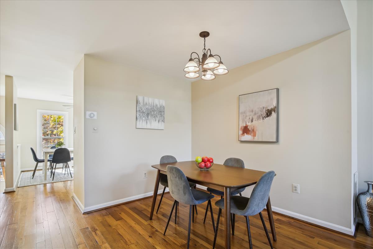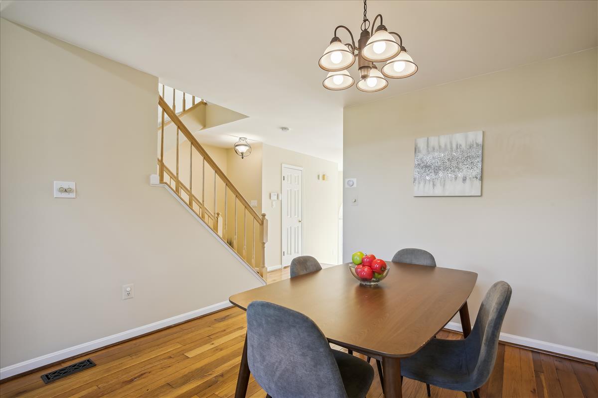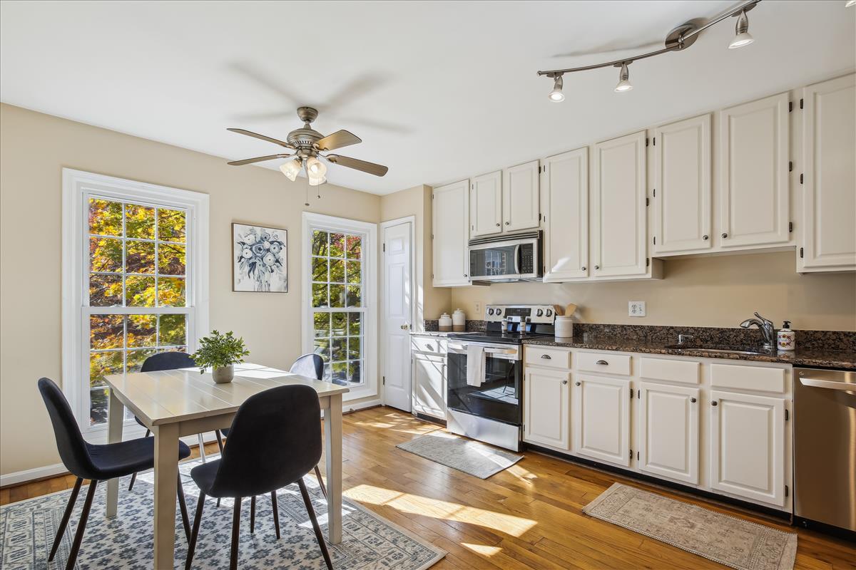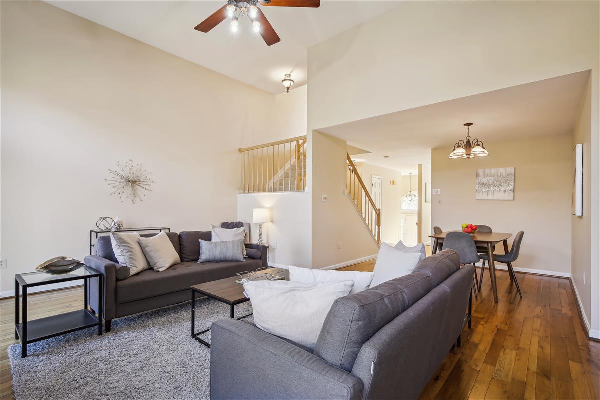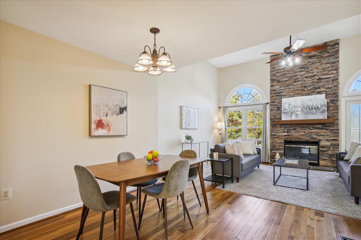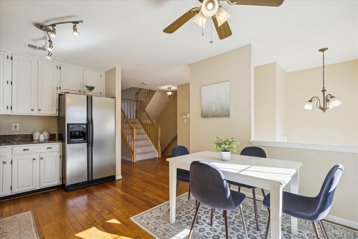 Beautiful townhome in Kingstowne with 3 bedrooms, 2 full bathrooms, & 2 half bathrooms! The main level features hardwood floors & neutral paint throughout. The spacious eat-in kitchen is accented with updated cabinets, granite countertops, a pantry, a ceiling fan, & stainless steel appliances including a new stove (2022) & newer dishwasher (2020). A separate formal dining area with chandelier sits next to the light-filled two-story living room with large windows, a gas fireplace with stone surround, and french doors leading to the back deck. A powder room completes this level. The expansive primary bedroom suite is located on its own level and features double doors, 3 large windows, vaulted ceilings, a ceiling fan, & a walk-in closet with custom organizers. The remodeled primary bathroom is accented with an extra-long granite-topped double vanity, a frameless glass walk-in shower with two showerheads, a built-in linen cabinet, & a vaulted ceiling with a skylight. The second upper level includes two bedrooms, both with custom Elfa closet shelving, and a second full bathroom with a vanity & sparkling white shower. The lower level features a spacious recreation room with plush carpeting that walks out to a fully fenced backyard and flagstone patio. A laundry closet, with a full-sized washer & dryer, and a powder room complete this level. Other home features include a new water heater (2022), newer HVAC (2020), & a 1-car garage with 2nd refrigerator, storage shelving & a large separate storage closet. Kingstowne amenities include community pools, fitness centers, tennis/volleyball courts, tot lots/playgrounds, walking paths, & MORE! Conveniently located only half a mile to numerous shopping, dining, & grocery store options. Just a short drive to access 395, 495, the metro station, the Pentagon, and Ft Belvior.