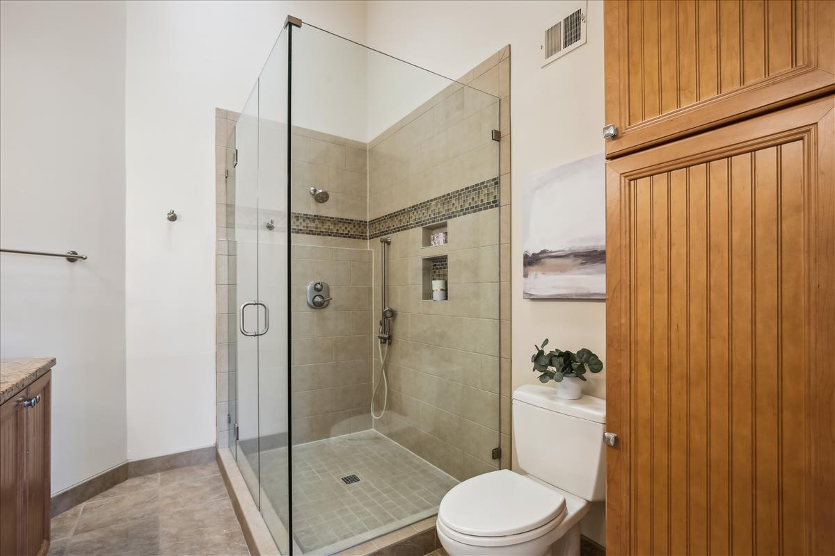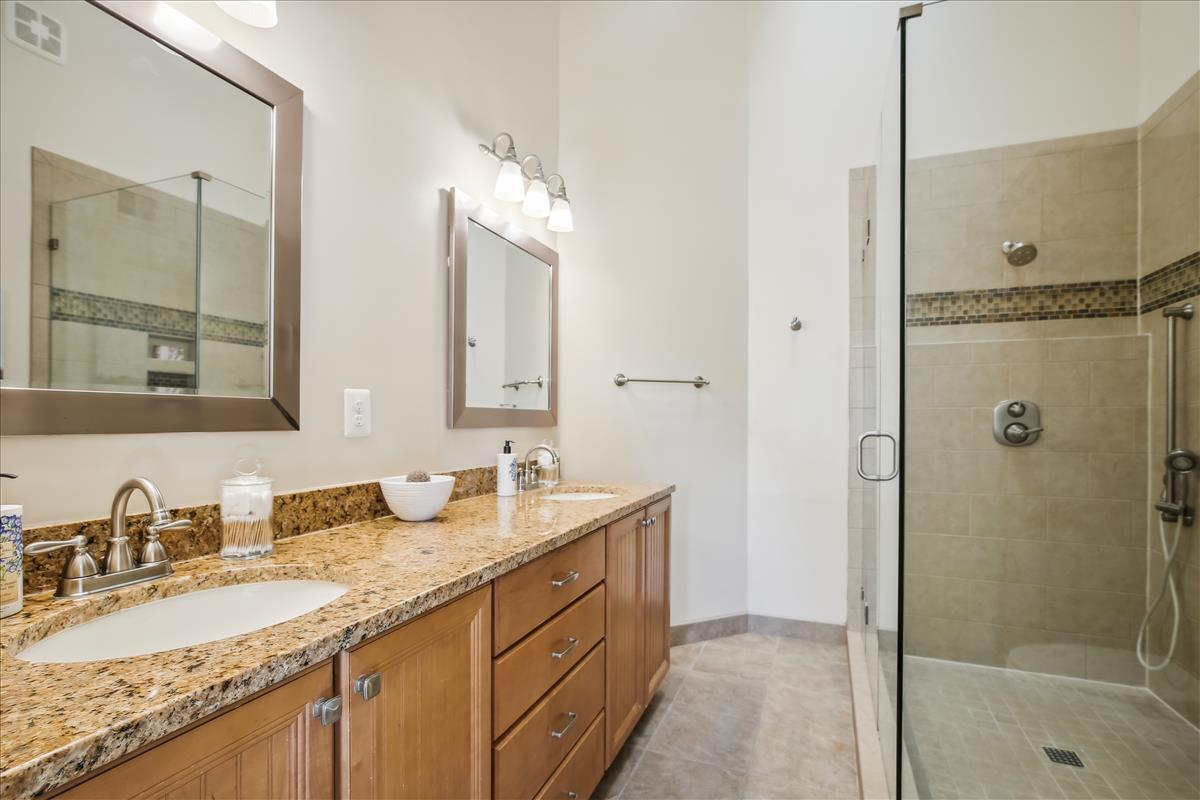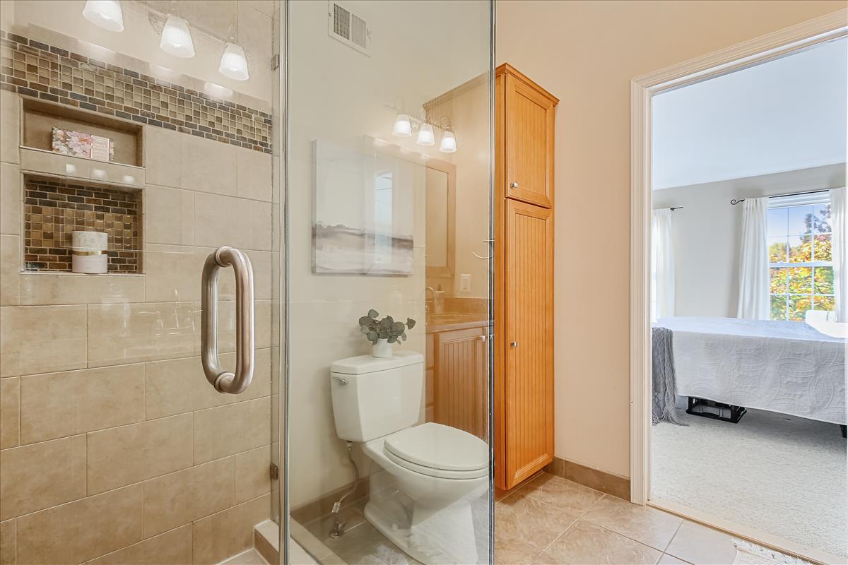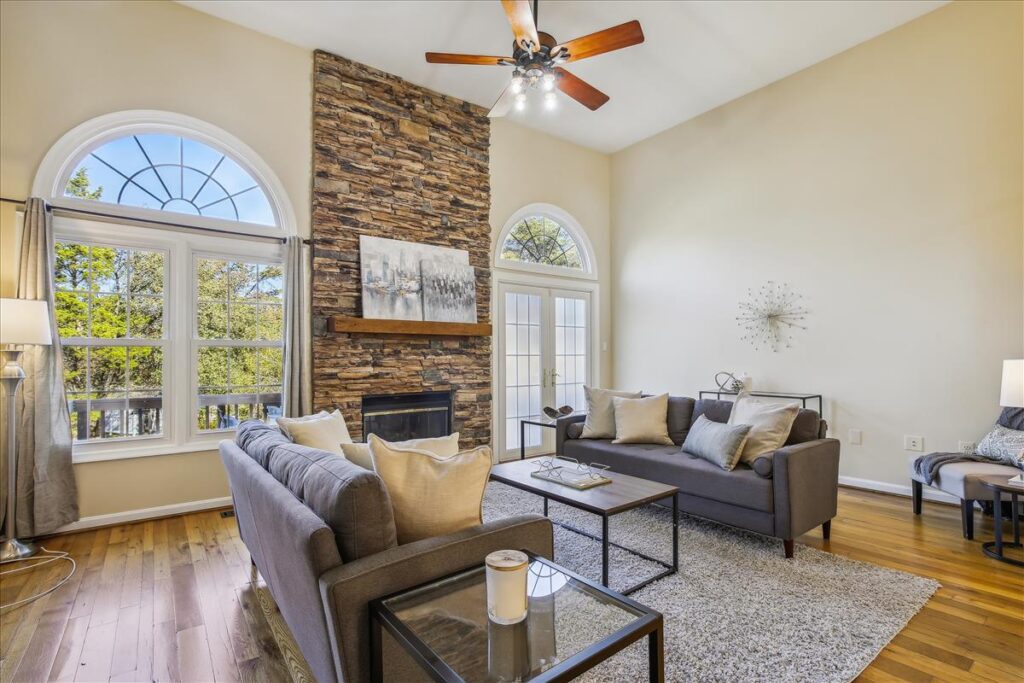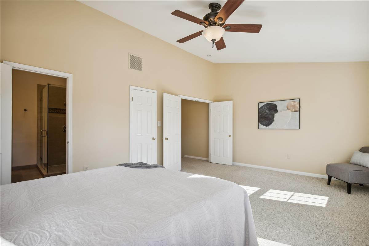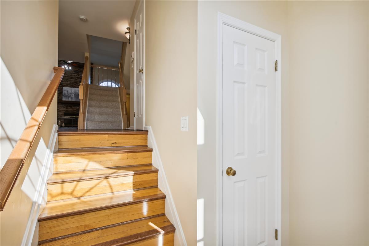 Beautiful townhome in Kingstowne with 3 bedrooms, 2 full bathrooms, & 2 half bathrooms! The main level features hardwood floors & neutral paint throughout. The spacious eat-in kitchen is accented with updated cabinets, granite countertops, a pantry, a ceiling fan, & stainless steel appliances including a new stove (2022) & newer dishwasher (2020). A separate formal dining area with chandelier sits next to the light-filled two-story living room with large windows, a gas fireplace with stone surround, and french doors leading to the back deck. A powder room completes this level. The expansive primary bedroom suite is located on its own level and features double doors, 3 large windows, vaulted ceilings, a ceiling fan, & a walk-in closet with custom organizers. The remodeled primary bathroom is accented with an extra-long granite-topped double vanity, a frameless glass walk-in shower with two showerheads, a built-in linen cabinet, & a vaulted ceiling with a skylight. The second upper level includes two bedrooms, both with custom Elfa closet shelving, and a second full bathroom with a vanity & sparkling white shower. The lower level features a spacious recreation room with plush carpeting that walks out to a fully fenced backyard and flagstone patio. A laundry closet, with a full-sized washer & dryer, and a powder room complete this level. Other home features include a new water heater (2022), newer HVAC (2020), & a 1-car garage with 2nd refrigerator, storage shelving & a large separate storage closet. Kingstowne amenities include community pools, fitness centers, tennis/volleyball courts, tot lots/playgrounds, walking paths, & MORE! Conveniently located only half a mile to numerous shopping, dining, & grocery store options. Just a short drive to access 395, 495, the metro station, the Pentagon, and Ft Belvior.